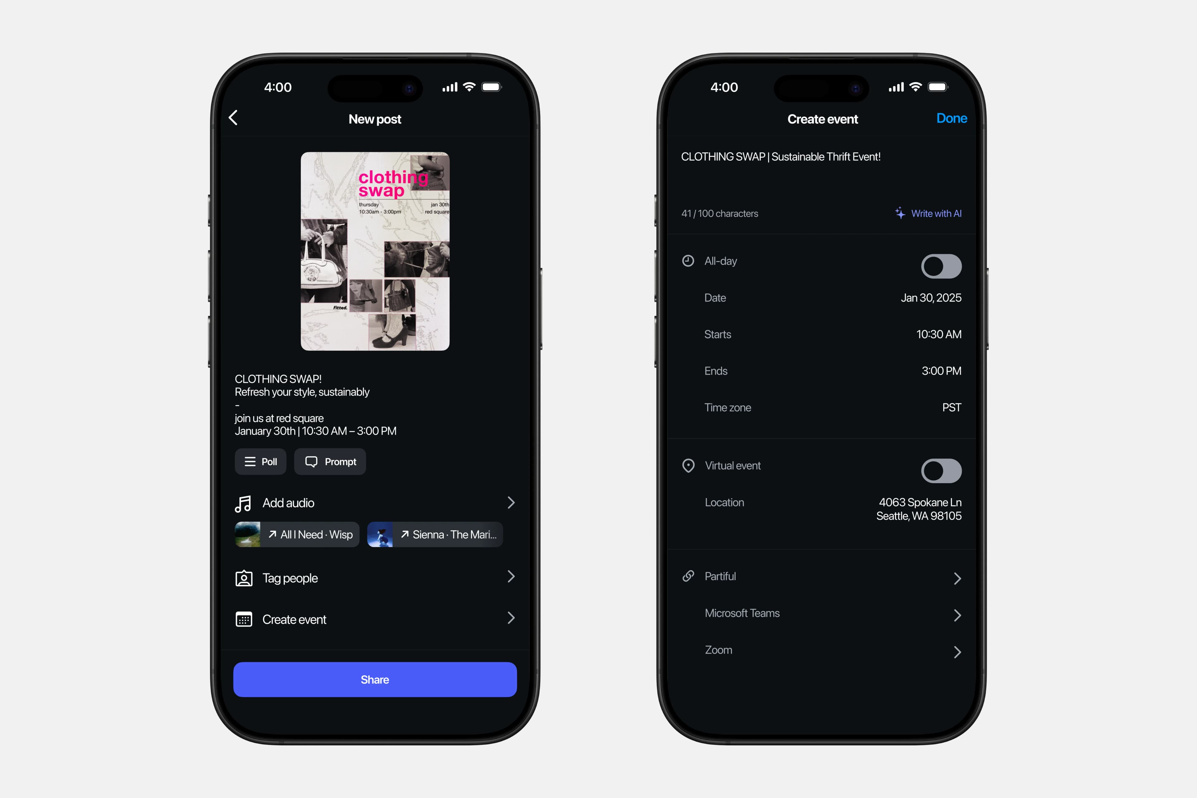 Event details and third-party integrations can be added to an event post. The information is then used to power various features that enhance event discovery and participation.