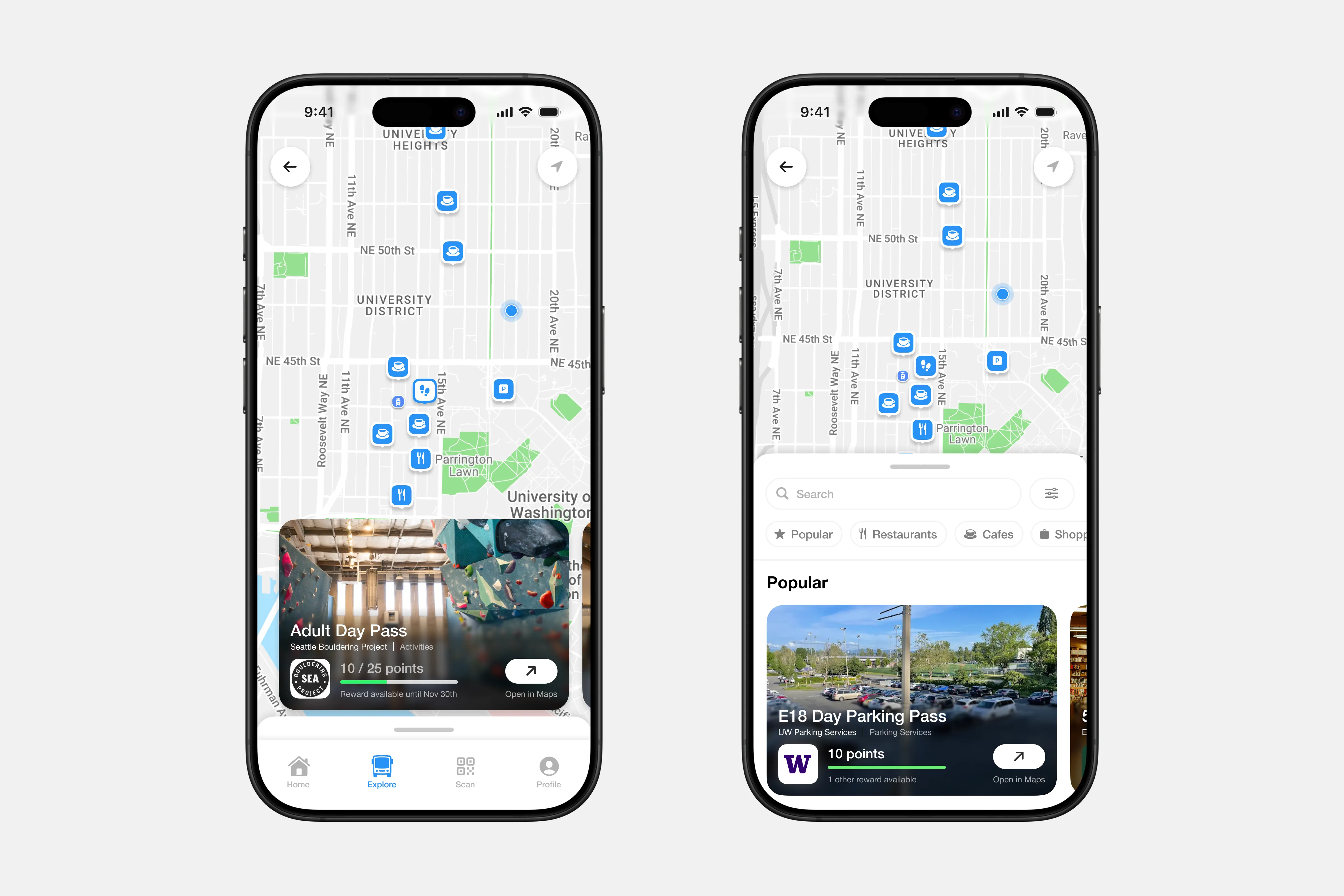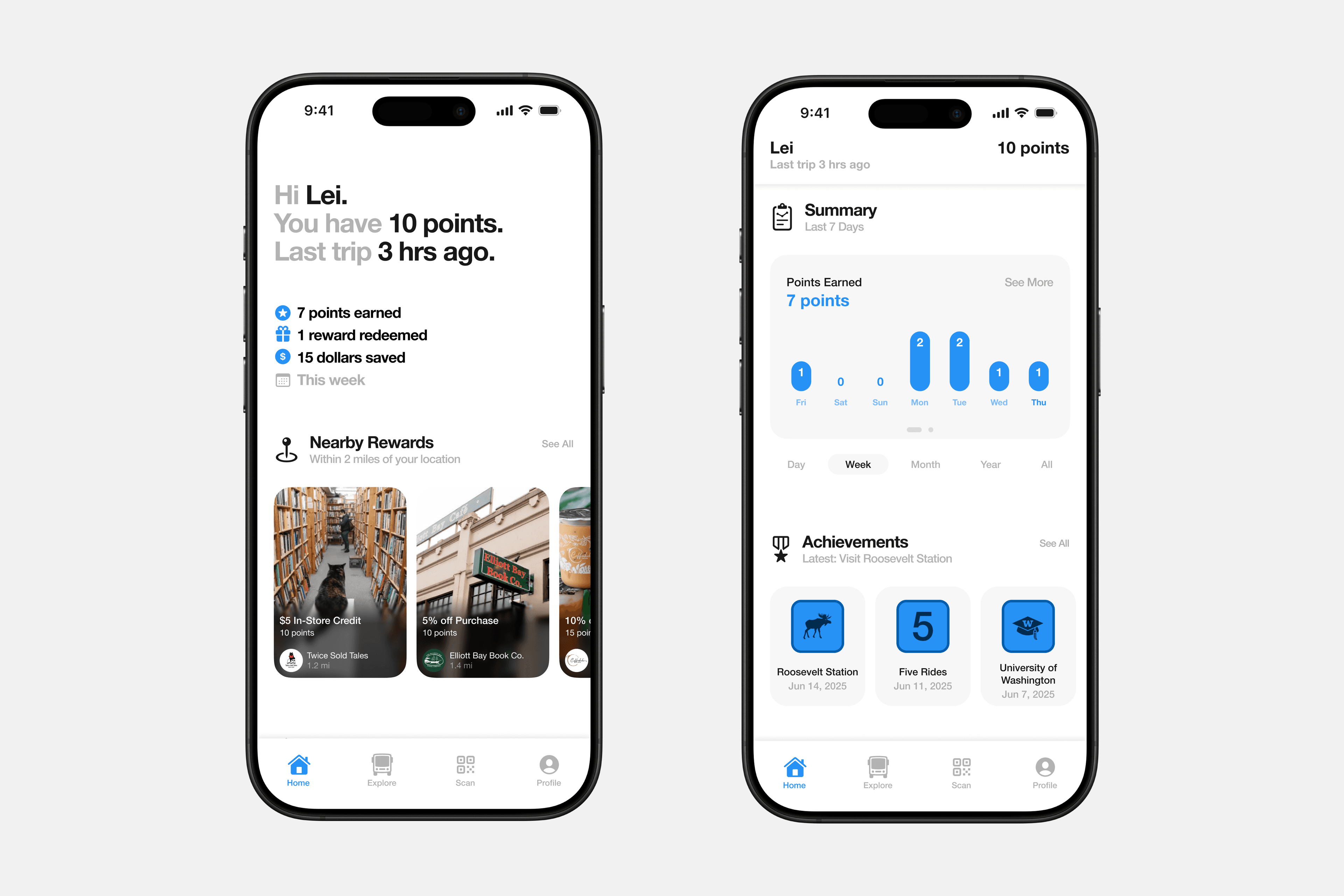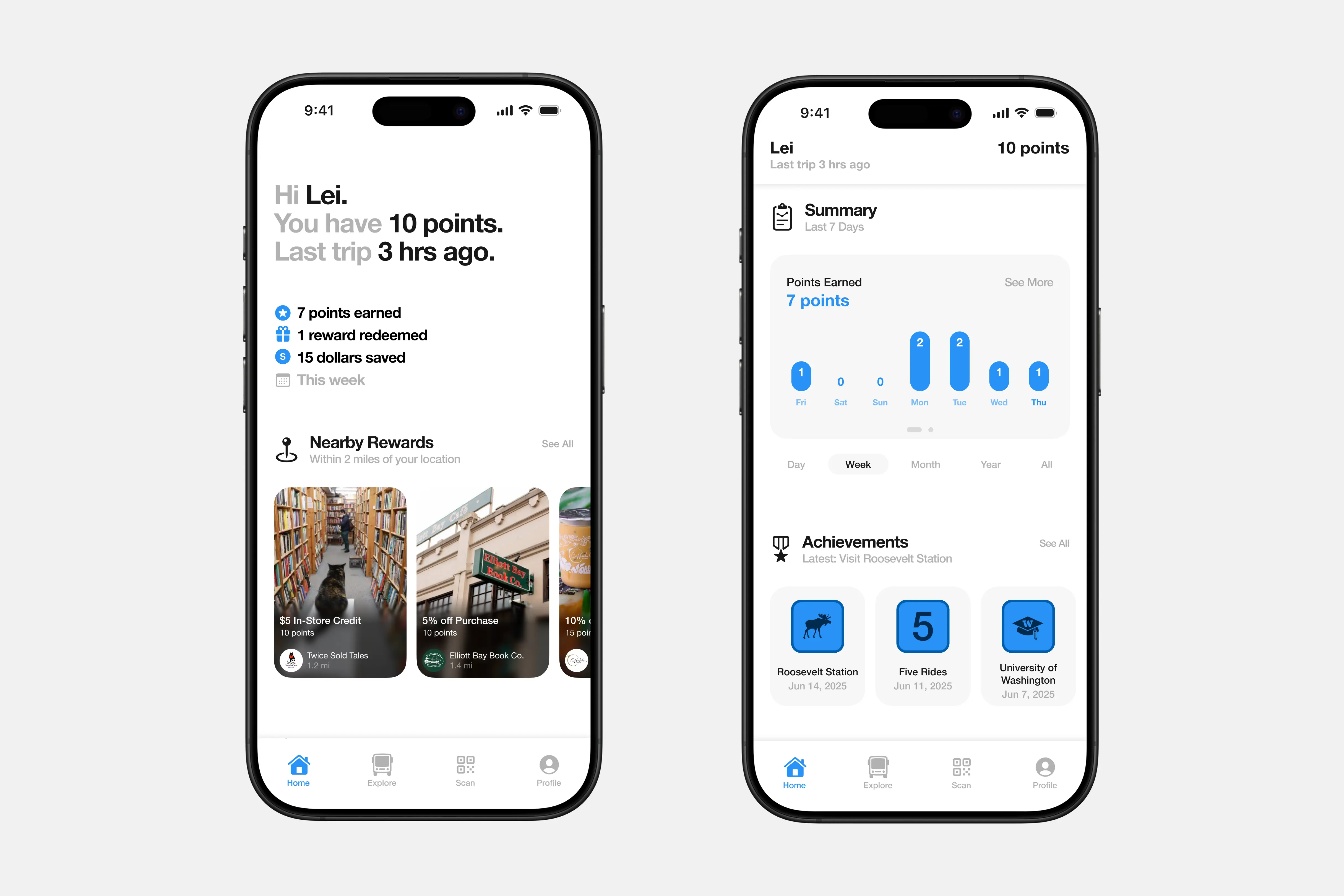 The explore page recommends the user with fun and popular Seattle destinations, and the estimated points earned if visited using transit. The rewards page displays a list of participating businesses offering discounts in exchange for points.