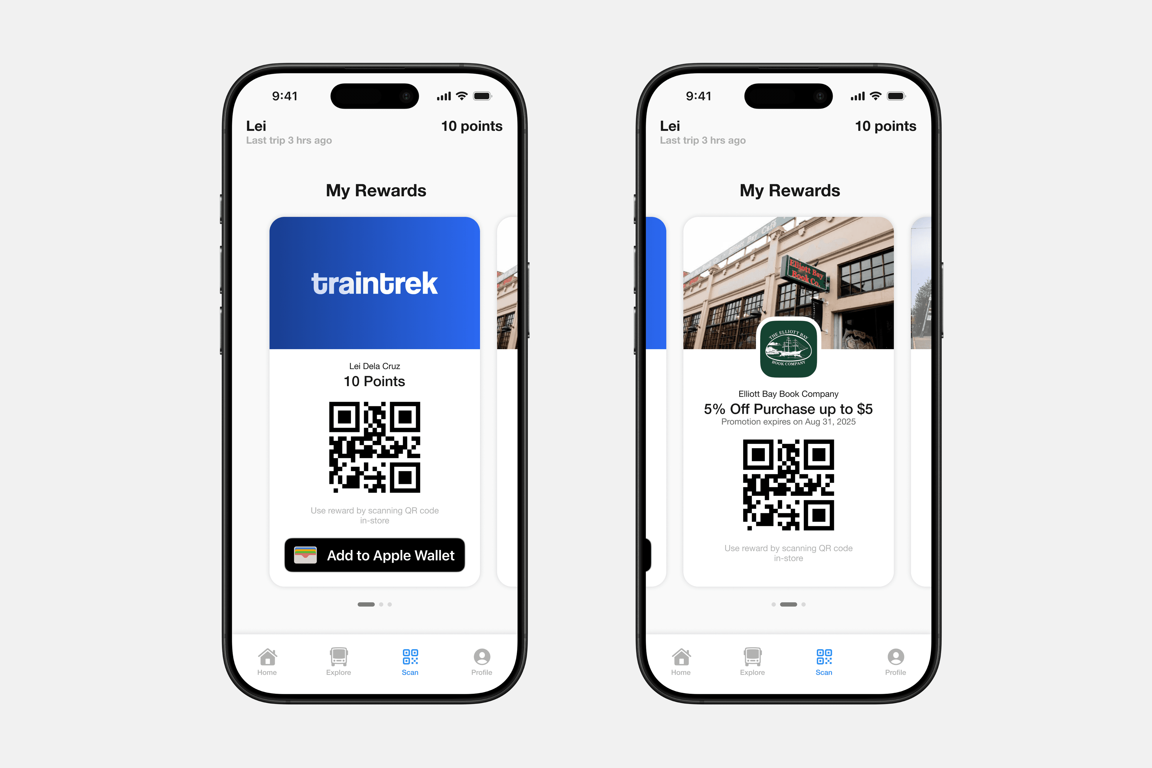 TrainTrek bridges this gap by rewarding riders for their trips. With points earned for every ride, a focused map of participating businesses, and easy QR code redemption, TrainTrek turns public transit into a rewarding habit.