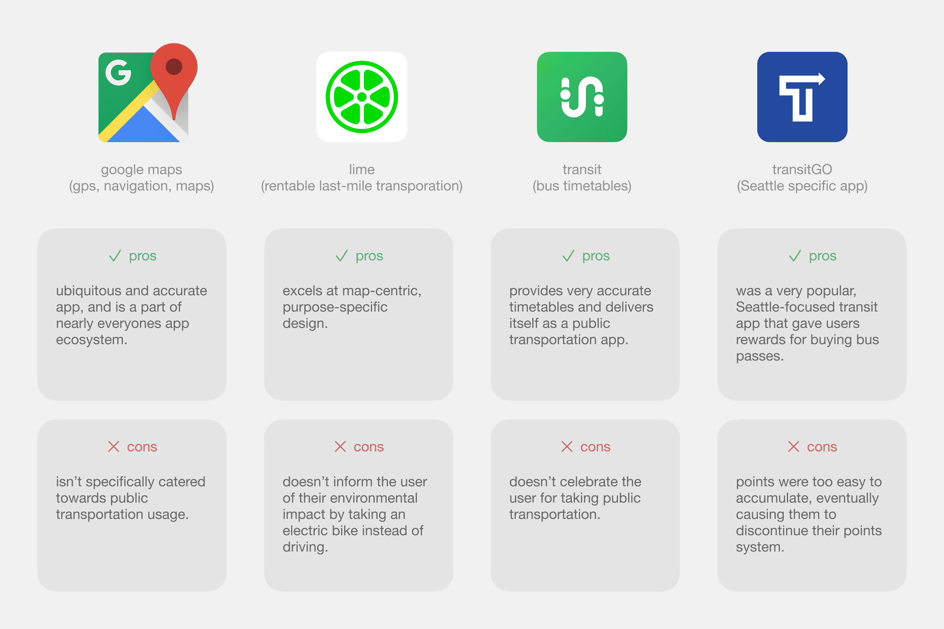 Through competitor analysis, we focused on how these apps promote transportation usage and include an interactive map.
