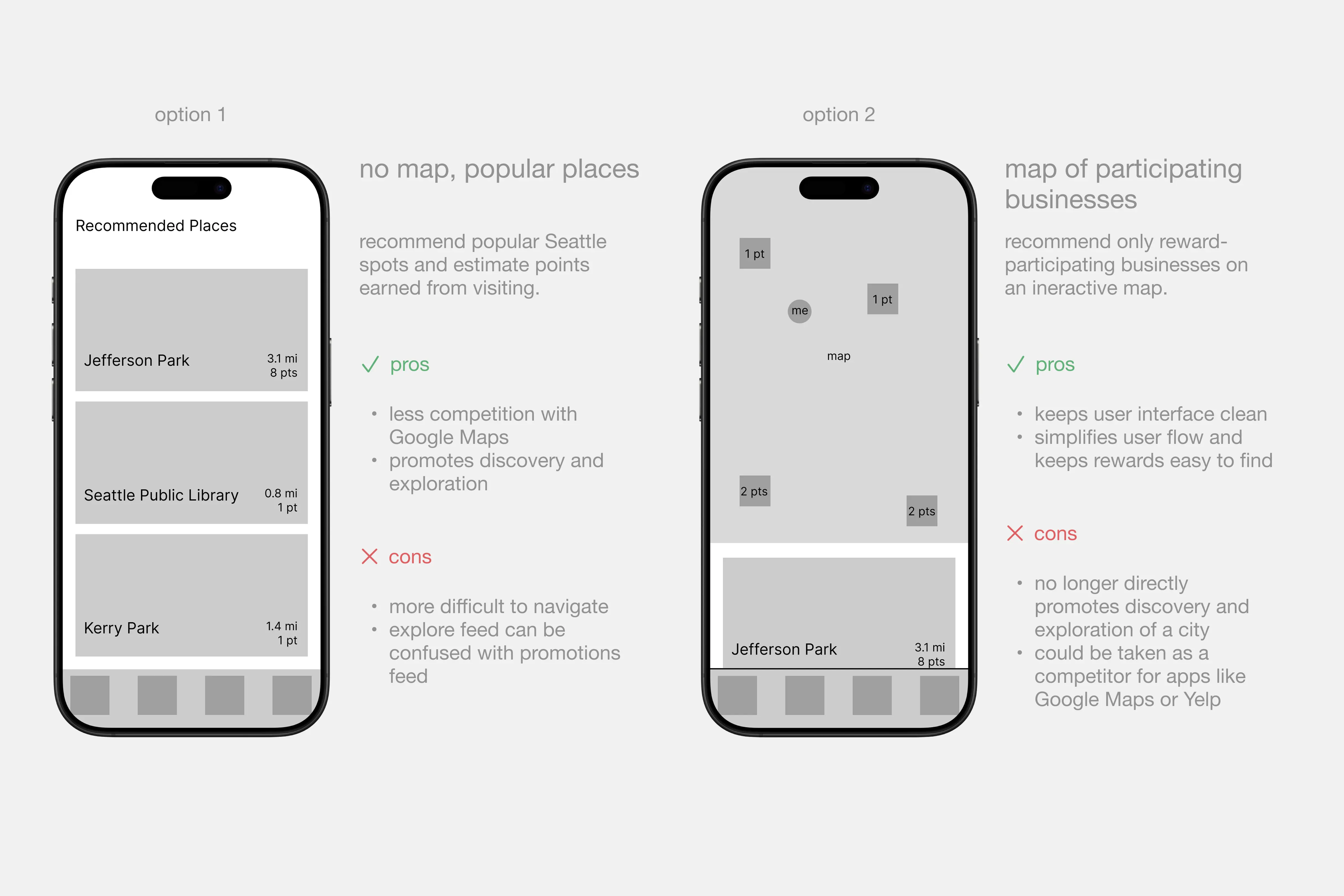 We considered two ways to implement our idea. The first focused on promoting the discovery of a city, and the second focused on promoting the businesses that would participate with the rewards program.