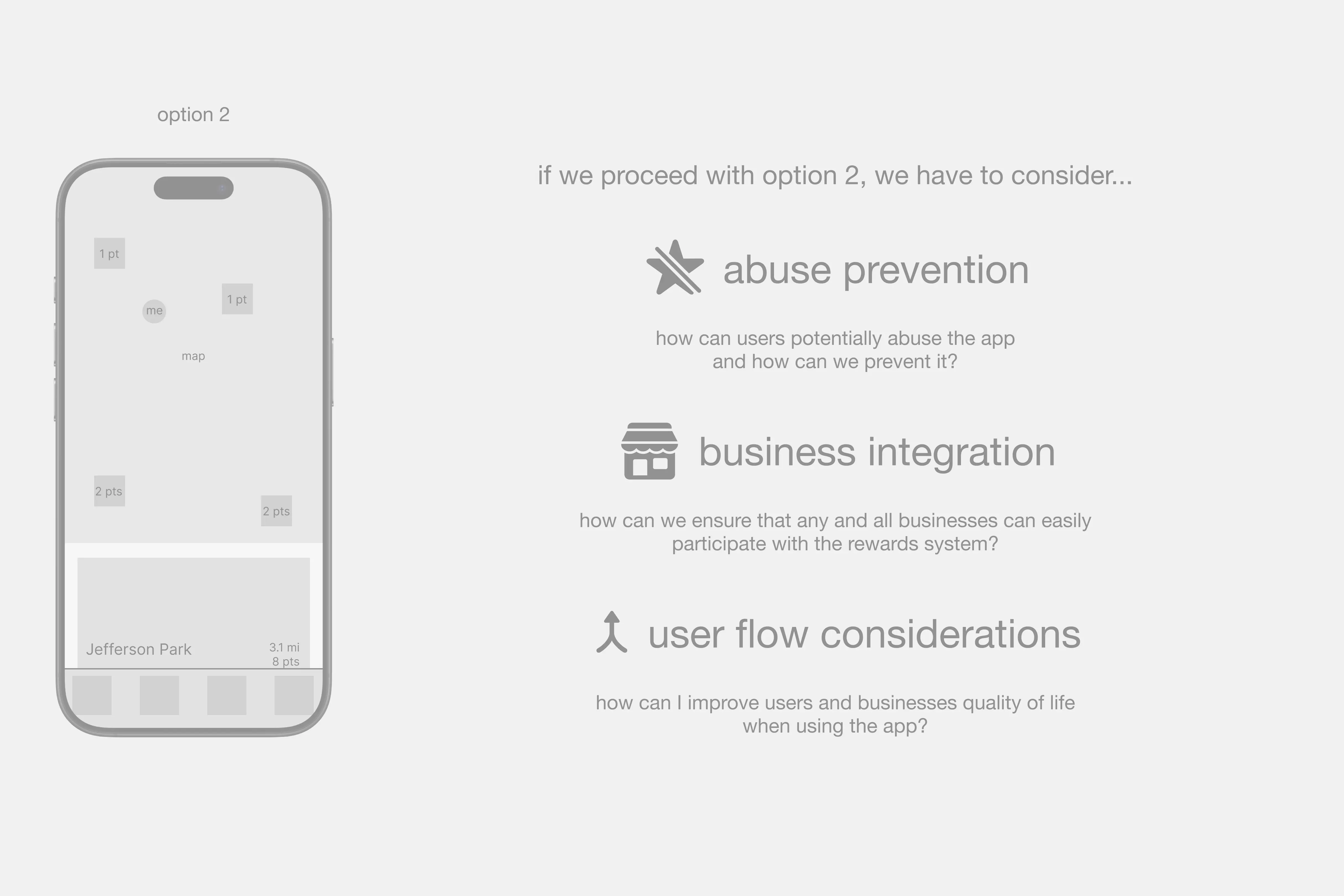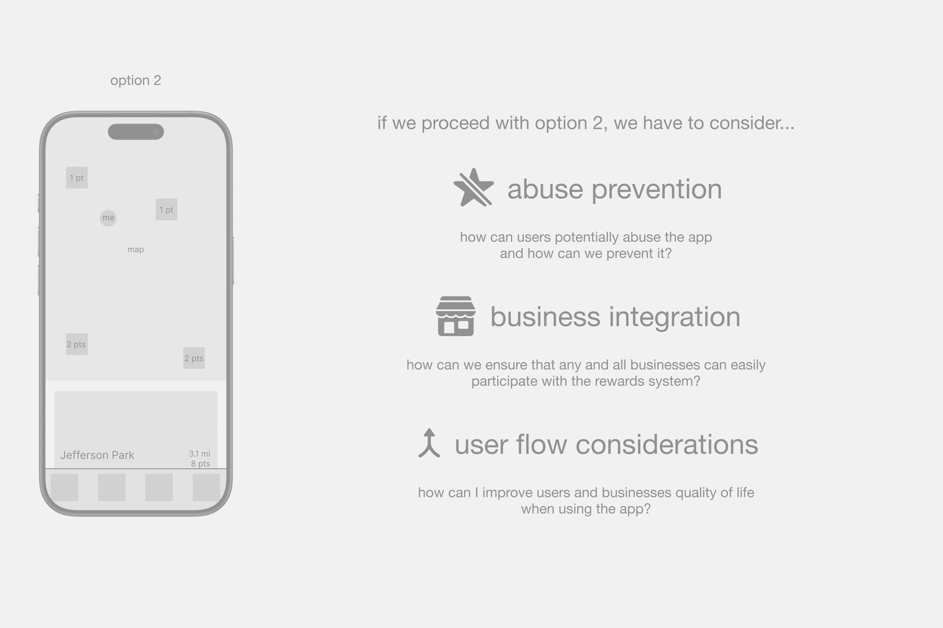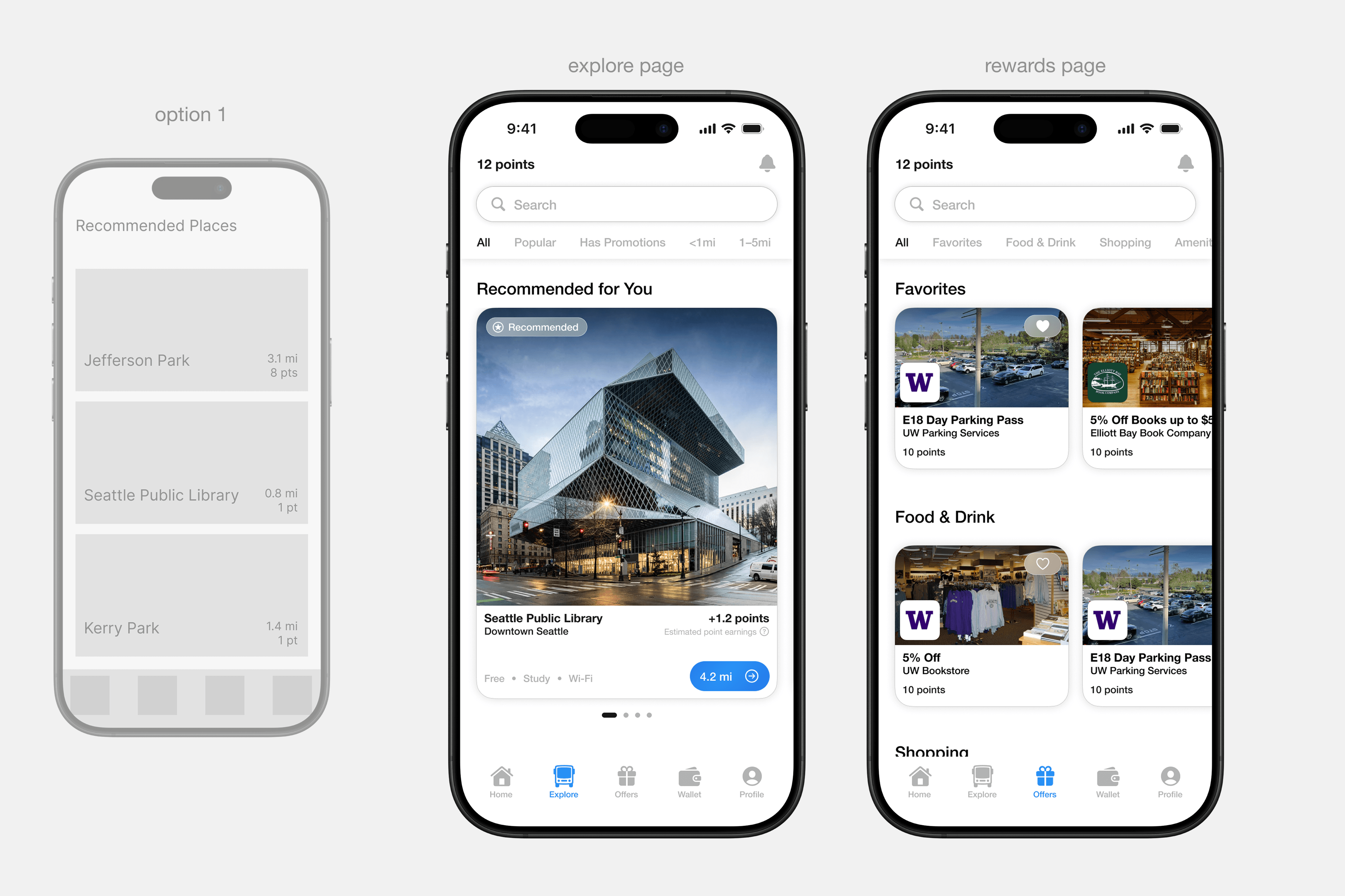 Partway through designing option 1, we realized one fatal flaw with this system. Seattle transit operates on a tap-on only system, meaning that there was no reliable way to keep track of a persons commute length. This meant that points had to be at a certain fixed amount of points per ride, making the explore page lose its value.